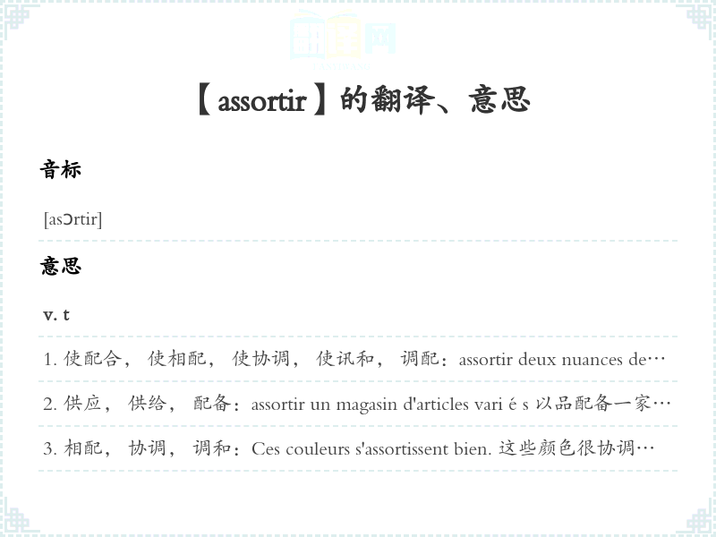 使配合, 使相配, 使协调, 使讯和, 调配:assortir deux nuances de laine à tricoter pour faire un chandail 用两颜色相近毛线配结在一件套衫assortir une chose à d'autres 使一东西方和其它东西相配assortir des convives 搭配宴会宾客, 安排宾客席位