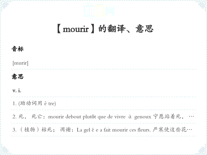 死, 死亡:mourir debout plutôt que de vivre à genoux 宁愿站着死, 不愿跪着生mourir en héros 英雄般地死去mourir à la peine 劳累而死mourir de maladie 病死mourir de vieillesse 老死mourir jeune 夭折mourir tout entière 默默无闻地死去faire mourir qn 处死某人, 杀死某人On n'en meurt pas. 这是不会死人的。 这没有什么严重的。 这没有什么大不了的。