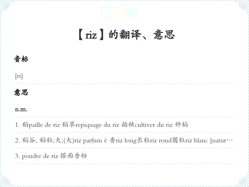 稻谷, 稻粒;大;(大)riz parfumé香riz long长粒riz rond圆粒riz blanc [nature]白riz cantonais(东)式蛋炒eau-de-vie de riz 酒riz au curry咖喱