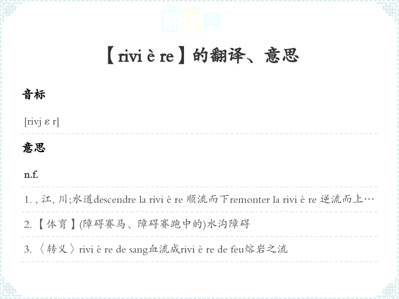 , 江, 川;水道descendre la rivière 顺流而下remonter la rivière 逆流而上traverser la rivière 过pêcher dans la rivière 在里捕鱼ne pas trouver de l'eau à la rivière 〈转义〉〈口语〉在里找不到水 [喻笨拙得连极易找到的东西也找不到]Les petits ruisseaux font les grandes rivières.〈谚语〉积水成渠。聚沙成塔。集腋成裘。