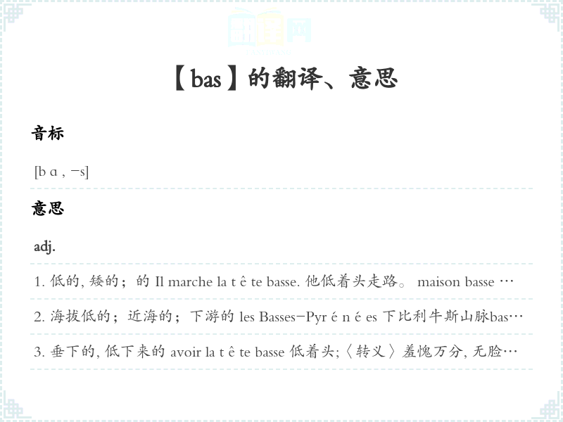 下面的, 下部的, 下方的bas étage 下面的les branches basses d'un arbre树的下部树枝soleil bas 夕阳Les nuages sont bas. 云低。Le temps [Le ciel] est bas. 天低云暗。ce [le] bas monde 人间, 尘世n.m.下部, 下端, 底部, 末端le bas du visage 脸的下部le bas d'une montagne 山脚, 山麓recoudre le bas du pantalon 重新缝裤脚的边le bas d'une gamme de produits [un produit bas de gamme](个系列中的)低档次产品des hauts et des bas 起伏bas de casse【印刷】字盘底部;小写字母铅字n.m.