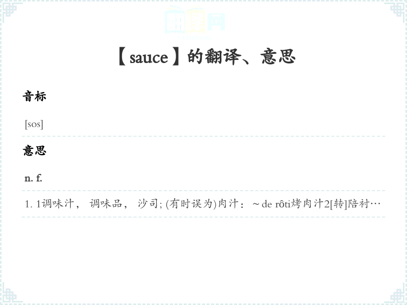 1调味汁, 调味品, 沙司; (有时误为)肉汁:~de rôti烤肉汁2[转]陪衬, 附属; 方式, 方法3[转, 俗]倾盆大雨, 阵雨4软黑铅笔5贵金属溶液(浸镀金属物品)