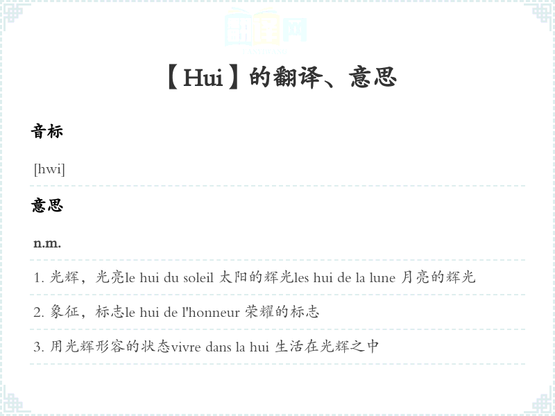 光辉,光亮le hui du soleil 太阳的辉光les hui de la lune 月亮的辉光