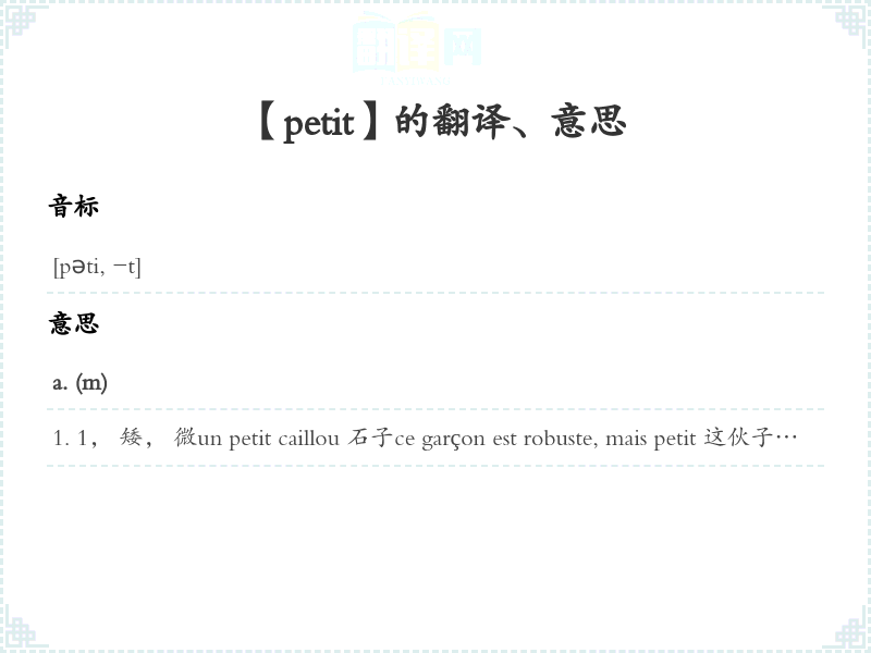 1, 矮, 微un petit caillou 石子ce garçon est robuste, mais petit 这伙子很健壮,但儿矮。2幼, 年幼petit enfant 孩quand vous étiez petit 当您时候3<引>娇[表示亲昵或轻视]4雏形, 缩了5微末, 紧要, , 地位低微n'avoir que de petits revenus 只有微薄收入ce n'est pas une petite affaire 这可不是一件事。6智力低下; 道德低下, 卑鄙, 渺, 卑下, 狭隘; 短暂un petit esprit 庸俗人7细, 细微[指怀、注意等] ; 写引>être aux petits soins pour qqn 对某人怀备至n.1孩; 家里最孩il est le petit de sa famille 在他家里他最2子女, 孩子; (动物)崽儿n. m1地位低微人, 人物, 弱者2低年级学生; 孩子3 le~, 渺, 微4 les infiniment~s微生物un~adv. [短语]<旧>稍稍地, 稍微旧>en~adv. [短语]缩地~à~adv. [短语]渐渐地, 逐渐