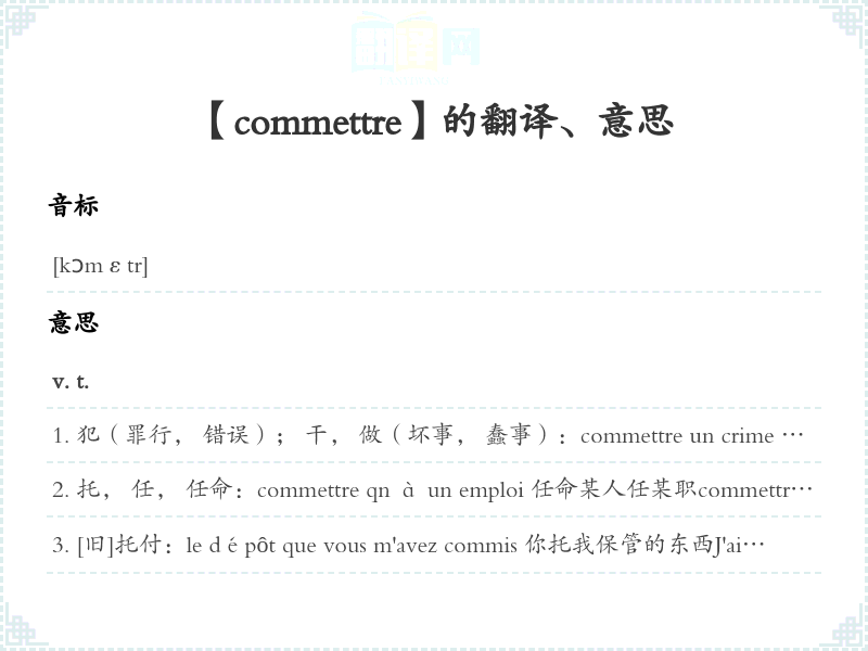 犯(罪行, 错误); 干, 做(坏事, 蠢事):commettre un crime 犯罪commettre une erreur (une faute) 犯错误