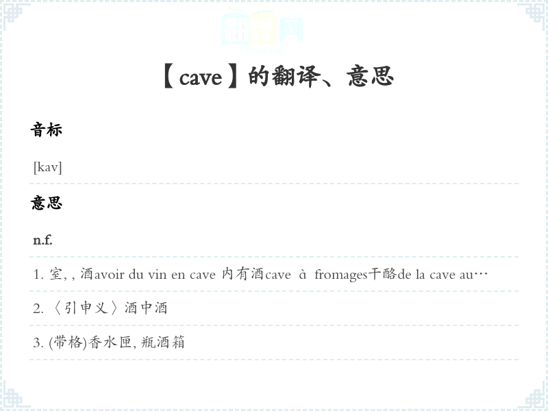 室, , 酒avoir du vin en cave 内有酒cave à fromages干酪de la cave au grenier上;头底;彻底rat de cave 〈转义〉线蜡烛;收税吏