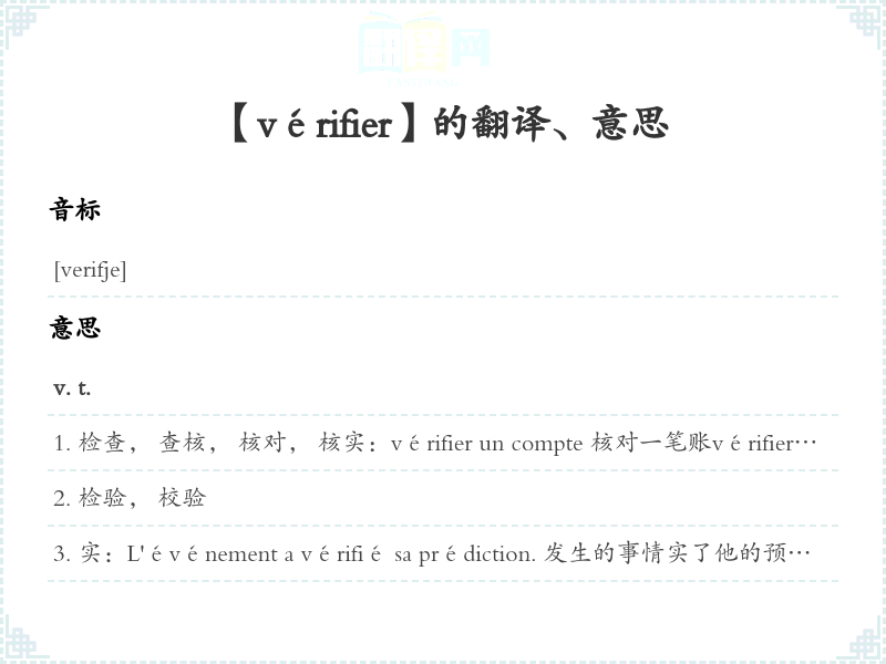 检查, 查核, 核对, 核实:vérifier un compte 核对一笔账vérifier une nouvelle 核实一条消息