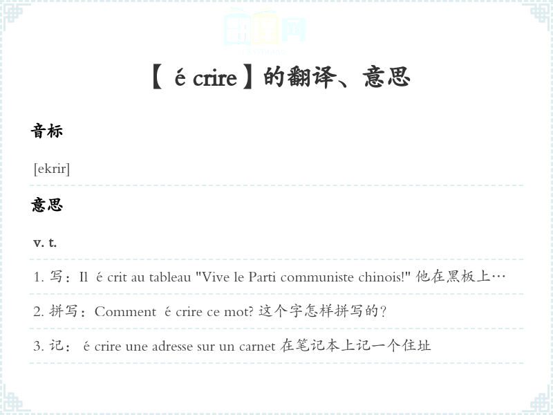 写:Il écrit au tableau "Vive le Parti communiste chinois!" 他在黑板上写:“中国共产党万岁!”[宾语省略]écrire gros (fin) 字写得粗大[细小]machine à écrire 打字机Avant la Libération, il ne savait ni lire ni écrire. , 他不会读也不会写。