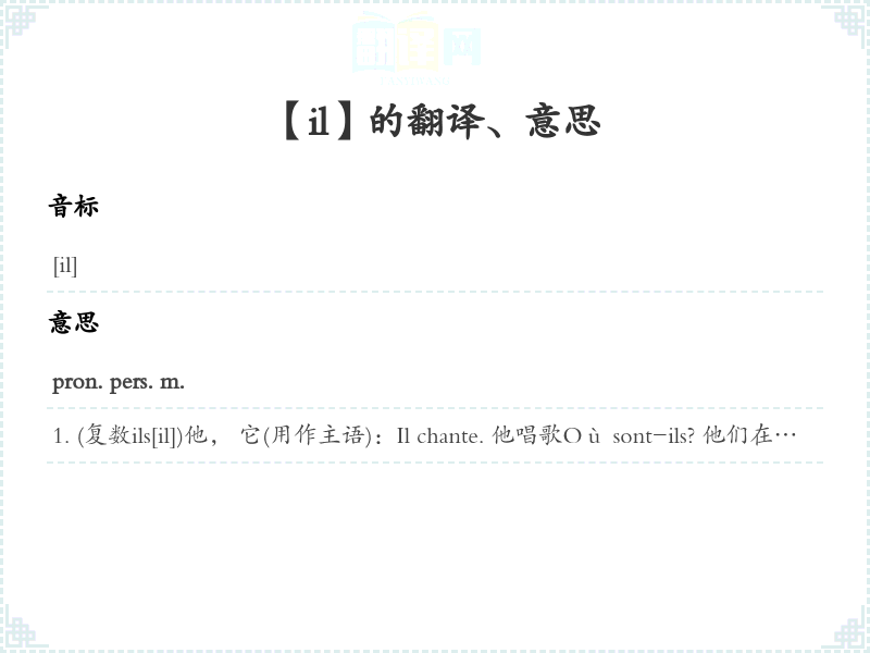 (复数ils[il])他, 它(用作主语):Il chante. 他唱歌Où sont-ils? 他们在什么地方?pron. neut.(用作无人称动词或无人称动词短语的主语):Il fait froid. 天气冷. Il pleut des balles. 子弹像雨点般落来.