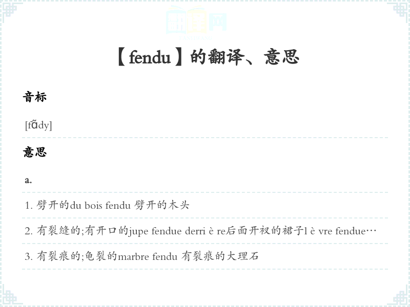 有裂缝的;有开口的jupe fendue derrière后面开衩的裙子lèvre fendue兔唇goupille fendue开口销