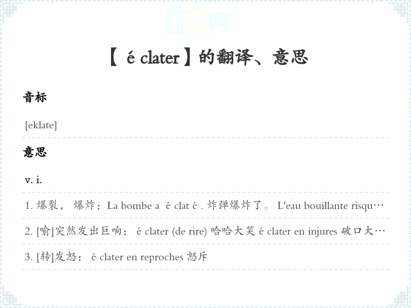 [喻]突然发出巨响:éclater (de rire) 哈哈大笑éclater en injures 破口大骂éclater en sanglots 嚎啕大哭Des applaudissements éclatèrent. 爆发出阵阵掌声。 La foudre éclate. 霹雳一声响。