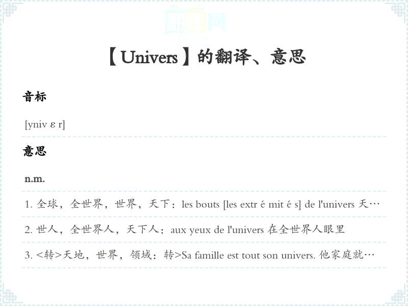 <转>天地,世界,领域:转>Sa famille est tout son univers. 他家庭就是他天地。univers mental 精神世界univers de son imagination 他想象世界univers du discours 【逻】论域