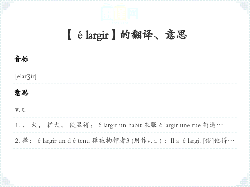 释:élargir un détenu 释被拘押者3 (用作v. i. ) :Il a élargi. [俗]他得魁梧了。s'élargir v. pr., 大:Le sentier s'élartissait. 小路了。