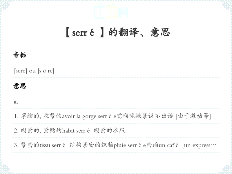 紧密的tissu serré 结构紧密的织物pluie serrée密雨un café [un express] serré 一杯浓咖啡une petite écriture fine et serrée细而密的小字体cheval serré du devant [du derrière]前肢 [后肢] 紧靠的马