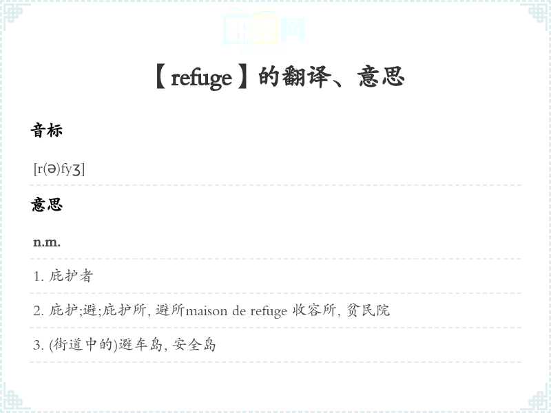 【refuge】 派生:、 联想:、 近义词:、 反义词: 联想词