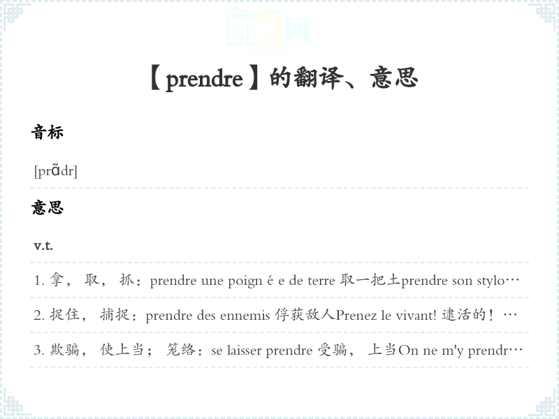 采取, 采用, 作出, 持, 装出, 表现出:prendre une attitude 持一种态度prendre un air innocent 装出无辜的样子prendre courage 鼓起勇气prendre la défense de 保护…, 保卫 …prendre une décision 作出一个决定prendre un engagement 立保证prendre fin 结束, 终止prendre la fuite 逃跑prendre garde 当心, 提防; 照顾prendre goût à 对…感兴趣, 爱好prendre haleine 喘息, 喘气prendre l'initiative 带头, 发动, 主动prendre des mesures de sécurité 采取安全措施prendre la parole 发言; 开始讲话prendre la parole de qn 取得某人的诺言prendre part 参加; 分享prendre son parti 打定主意; 死了心prendre le pas sur qn 赶在某人前头; [转]排挤某人prendre patience 忍耐prendre de la peine 努力工作, 辛勤劳动prendre la peine de 劳驾…, 费心…:Prenez la peine d'entrer 劳驾请进。 prendre plaisir à 喜欢…, 乐于 …prendre position 表态, 采取立场prendre du repos 休息prendre sa retraite 退休prendre sa revanche 翻回第二局, 赢回第二盘prendre des risques 冒险prendre du soin à 细心护理…; 照顾 …, 关心 …prendre son vol 起飞prendre la tête 带头, 居首3