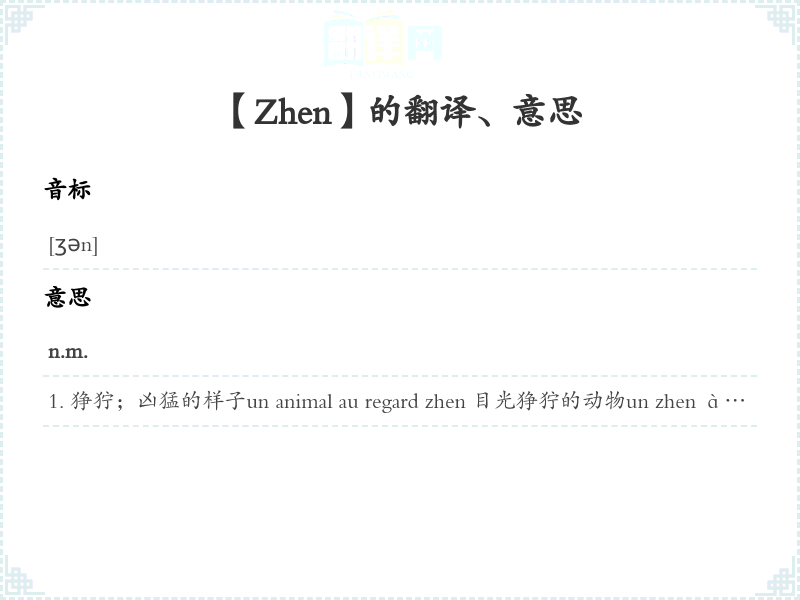 狰狞;凶猛的样子un animal au regard zhen 目光狰狞的动物un zhen à la voix rauque 声音沙哑的狰
