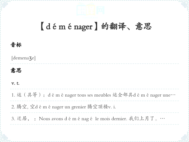 运(具等):déménager tous ses meubles 运全部具déménager une maison 走房子里的具