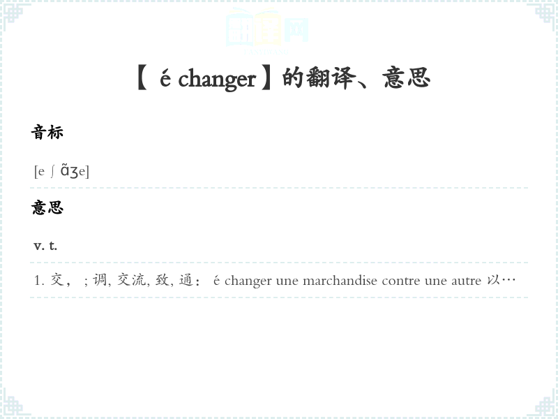 交, ; 调, 交流, 致, 通:échanger une marchandise contre une autre 以一种商品交另一种商品échanger des opinions 交意见Ils ont échangé des lettres. 他们通信。 échanger des sourires 笑s'échanger v. pr.(被)交:Les produits s'échangent contre les produits. 产品产品。