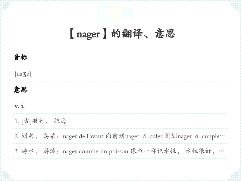 游水, 游泳:nager comme un poisson 像鱼一样识水性, 水性很好, 游得很好nager sous l'eau 潜泳nager entre deux eaux 潜泳; []周旋于双方之间savoir nager []善于随机应变, 善于周旋nager contre le courant 逆水游泳; []逆流而行nager dans les eaux de qn []跟某人意见一致, 站在某人一边
