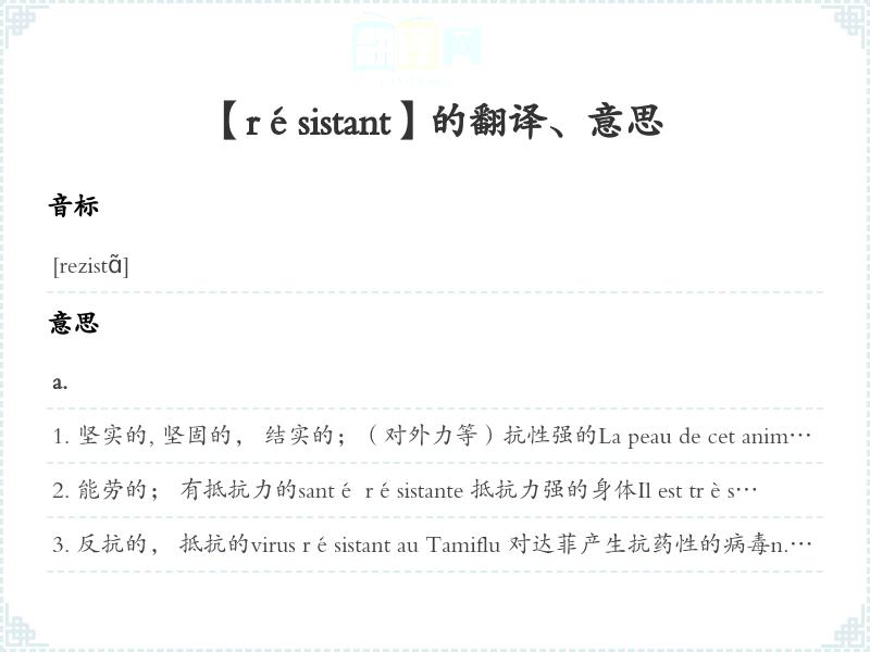 反抗的, 抵抗的virus résistant au Tamiflu 对达菲产生抗药性的病毒n.(第二次世界大战期间法国的)抵抗运动的成员