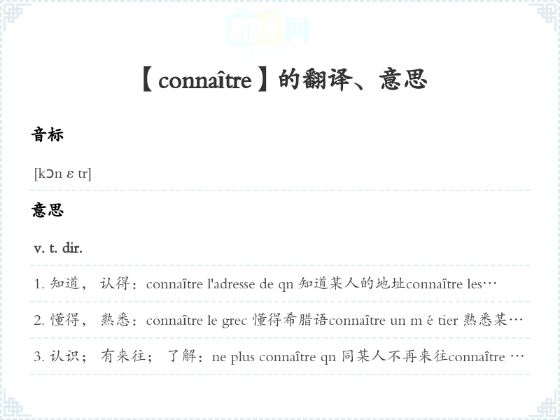 知道, 认得:connaître l'adresse de qn 知道某人的地址connaître les aspirations du peuple 了解人民的愿望faire connaître son sentiment 表达自己的感情, 表达自己的想法Je connais ce chemin. 我认得这条路。 Si l'on veut connaître la théorie et les méthodes de la révolution, il faut prendre part la révolution. 你要知道革命的理论和方法, 你就得参加革命。