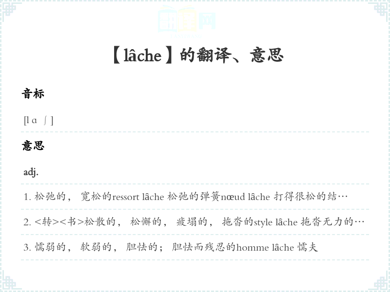松弛的, 宽松的ressort lâche 松弛的弹簧nœud lâche 打得很松的结étoffe trop lâche 织得太松的织物
