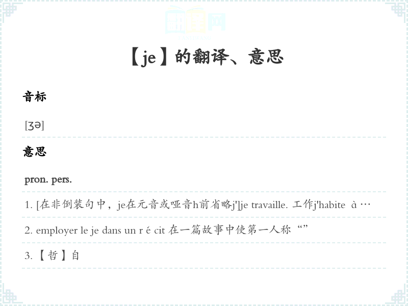 [在非倒装句中,je在元音或哑音h前省略j']je travaille. 工作j'habite à beijing 住在北京n.m.inv.