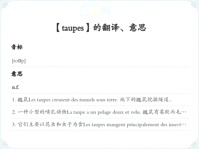 【taupes】 助记:、 词根:、 联想、 名词化:、 词化:、 形容词化:、 近义词、 反义词、 同音、近音词 联想词