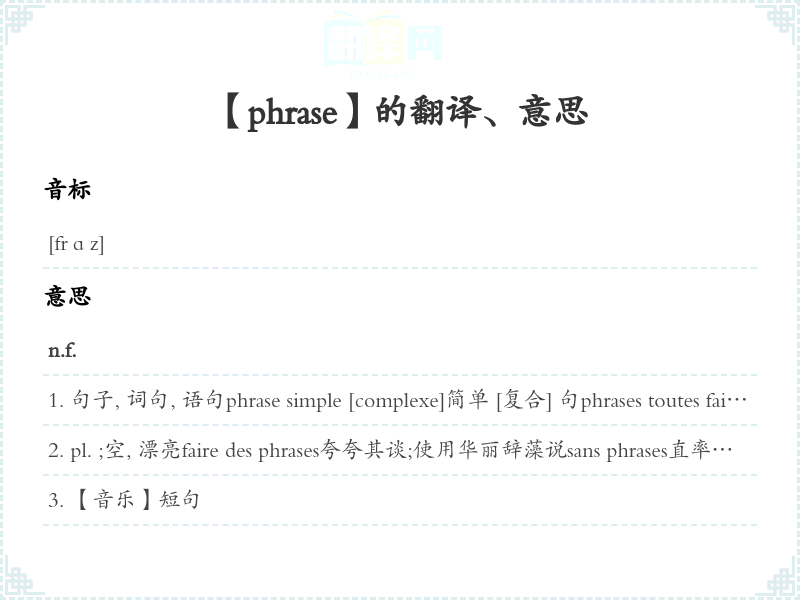 pl. ;空, 漂亮faire des phrases夸夸其谈;使用华丽辞藻说sans phrases直率地, 直截了当地
