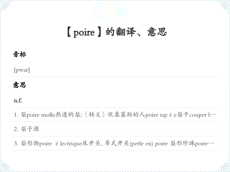 梨poire molle熟透的梨;〈转义〉优柔寡断的人poire tapée梨干couper la poire en deux〈转义〉平分;达成协议, 妥协garder une poire pour la soif〈转义〉积谷防饥entre la poire et le fromage茶余饭后La poire est mûre.〈旧语,旧义〉时机已经成熟。