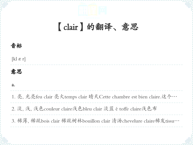 清楚, 显, 白, 确voir clair 清楚看到essayer d'y voir clair 试图搞懂parler clair 说话清楚;〈转义〉说话确