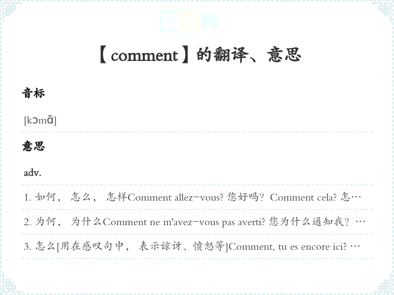 如何, 怎么, 怎样Comment allez-vous? 您好吗?Comment cela? 怎么回?这是什么意思?Comment faire? 怎么办?n'importe comment 随便怎么样;胡乱,马马虎虎il faut voir comment 真是没话说,真是难以形容[表示程序]Dieu sait comment 天知怎样