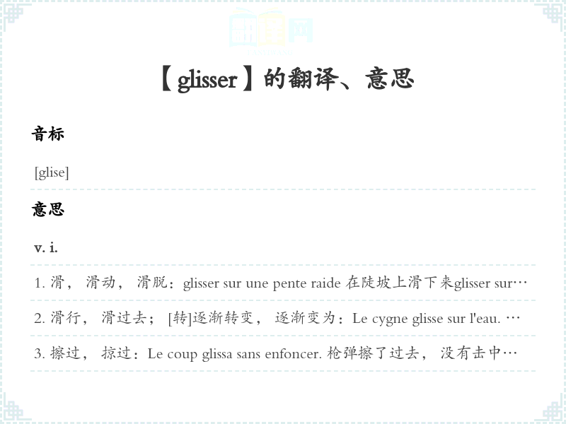 滑行, 滑过去; [转]逐渐转变, 逐渐变为:Le cygne glisse sur l'eau. 天鹅在水上浮游。 électorat quiglisse à gauche <喻>逐渐倾向左派选民se laisser glisser [俗]死亡喻>