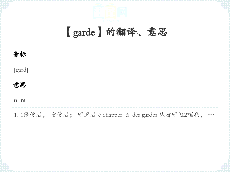 1保管者, 看管者; 守卫者échapper à des gardes 从看守逃2哨兵, 卫兵3狱卒, 看守4侍卫, 卫士, 警卫员5近卫军士兵, 警卫队士兵n. f女护士; 护理病, 照看小孩