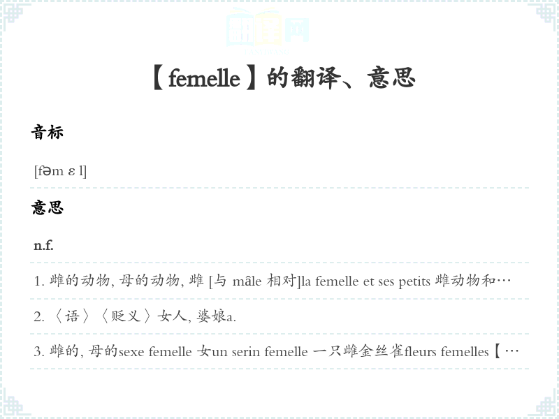 雌的, 母的sexe femelle 女un serin femelle 一只雌金丝雀fleurs femelles【植物学】雌花un démon femelle 〈口语〉〈贬义〉一个母夜叉