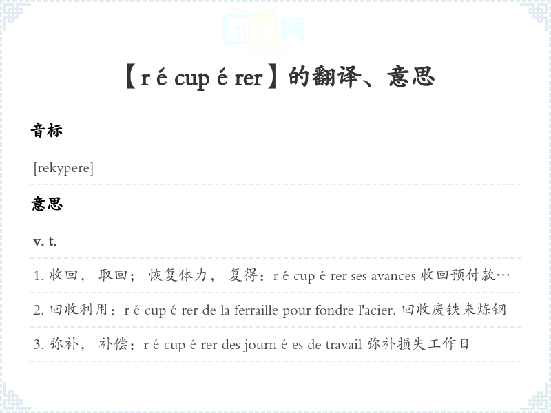 收回, 取回; 恢复体力, 复得:récupérer ses avances 收回预付款récupérer les livres qu'on a prêtés 把借出去书收回来récupérer (ses forces) 恢复体力:Certains athlètes récupèrent très vite. 能很快恢复体力。