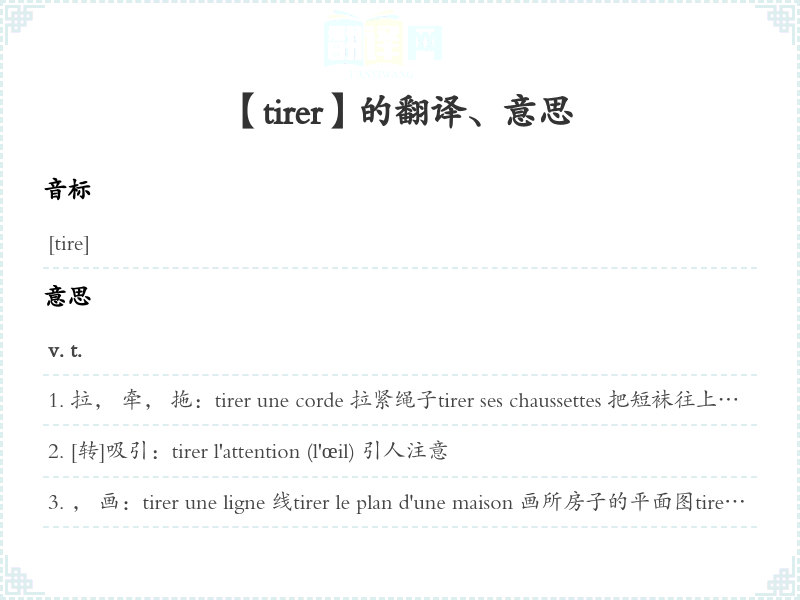拉, 拖; 通风, 拔风:tirer de toutes ses forces 拼命拉poêle qui tire bien 通风好的炉灶tirer en longueur 拖延下去tirer sur 拉, 拖; 用力吸:tirer sur une ficelle 拉根细绳子tirer sur la ficelle [转]夸张, 夸大tirer sur les rênes 勒住缰绳tirer sur le tuyau de sa pipe 用力吸烟斗