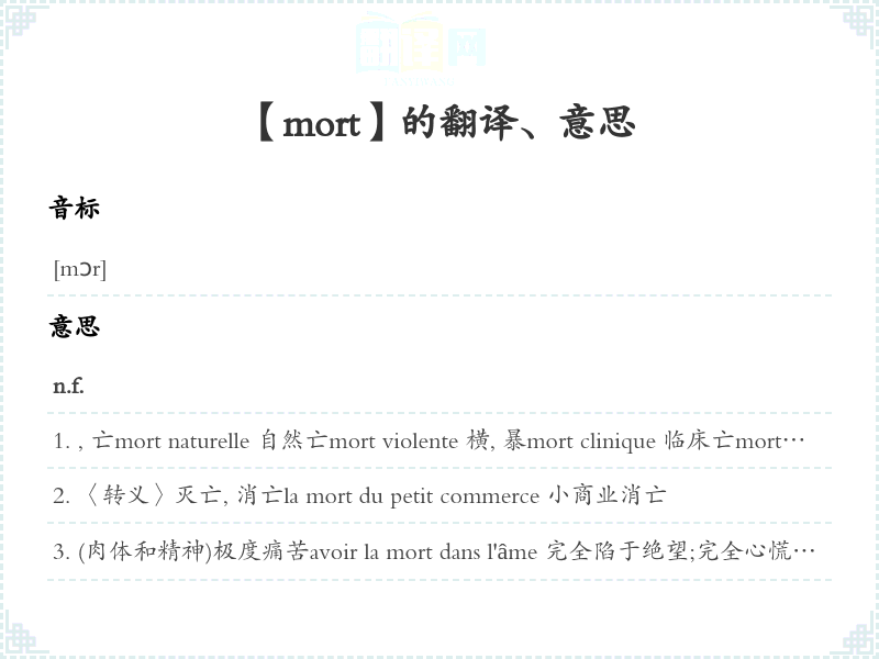 ,亡;枯, 枯萎mort au champ d'honneur 战沙场être à moitié [comme] mort 半mort de froid 冻feuilles mortes 枯叶