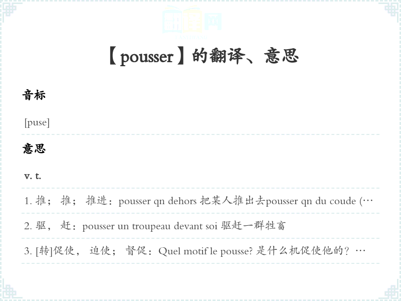 【pousser】 助记:、 词根:、 派生:、 用法:、 名词变化:、 形容词变化:、 近义词、 反义词、 同音、近音词 联想词
