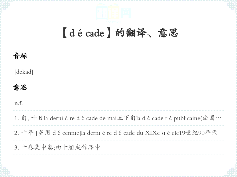 十年 [多用 décennie]la dernière décade du XIXe siècle19世纪90年代