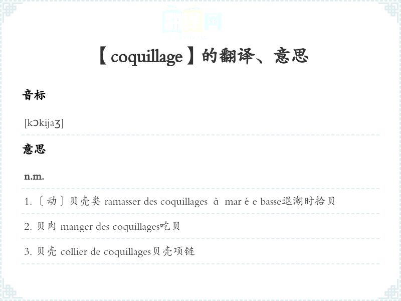 【coquillage】 联想:、 名词变化:、 近义词: 联想词