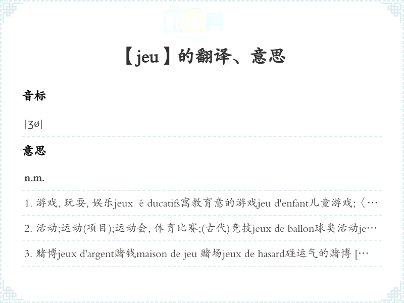 游戏, 玩耍, 娱乐jeux éducatifs寓教育意的游戏jeu d'enfant儿童游戏;〈〉极容易的事, 无足轻重的事Ce n'est qu'un jeu pour lui.这对他来说易反掌。jeu d'esprit趣味游戏un simple jeu d'esprit〈〉诙谐, 玩笑jeu de groupe集体游戏jeux intellectuels智力游戏jeux électroniques电子游戏jeu de mots文字游戏 [双关、谐音]jeux de main(s)拍打游戏Jeux de mains, jeux de vilains.〈谚语〉打着玩最后总会闹成真打。jeux de société室内游戏 [猜谜、跳棋等]règle du jeu 游戏规则jeux de prince〈旧语,旧〉建筑在别人痛苦上的玩乐jeu du destin [de la fortune]运的播弄jeu d'écritures记账par jeu 出于好玩se faire un jeu des difficultés易反掌地克服困难Je me fais un jeu d'y arriver.我轻而易举就能办到。