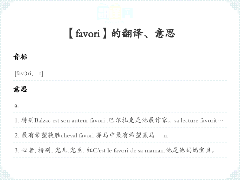 【favori】 名词变化:、 动词变化:、 形容词变化:、 副词变化:、 近义词:、 反义词: 联想词