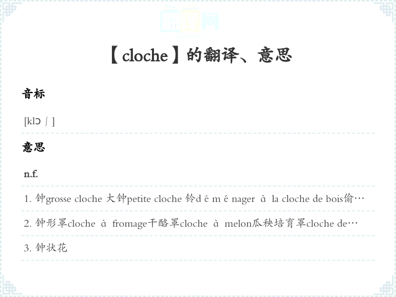 钟grosse cloche 大钟petite cloche 铃déménager à la cloche de bois偷偷地搬家entendre un autre son de cloche 听到另一种说法sonner les cloches à qn〈口语〉严某人Qui n'entend qu'une cloche n'entend qu'un son.〈谚语〉兼听则明, 偏听则暗。