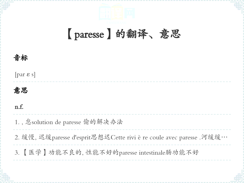 【医学】功能不良的, 性能不好的paresse intestinale肠功能不好