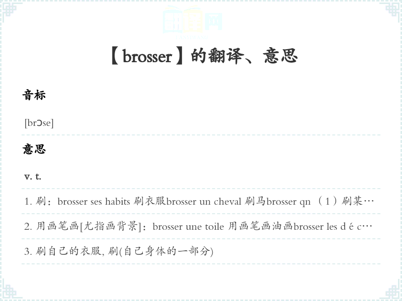 刷:brosser ses habits 刷衣服brosser un cheval 刷马brosser qn (1)刷某人身上穿的衣服(2)[转, 俗]痛打某人(在游戏、赌博中)战胜某人
