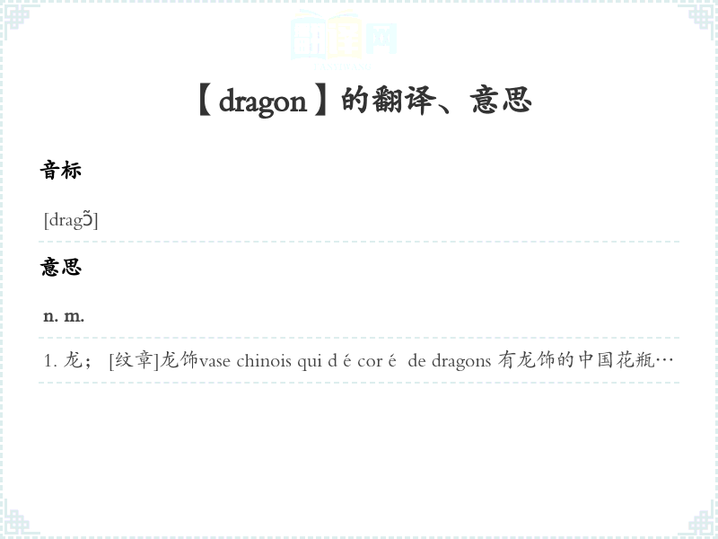 龙; [纹章]龙饰vase chinois qui décoré de dragons 有龙饰的中国花瓶[转]凶恶严格的看守, 机警严厉的监护人; [旧]悍妇, 泼妇~volant [动]斑飞蜥D~[天]天龙(星)座(金刚钻上的)瑕疵[海]三角补助帆(旧时的)龙~s portés托