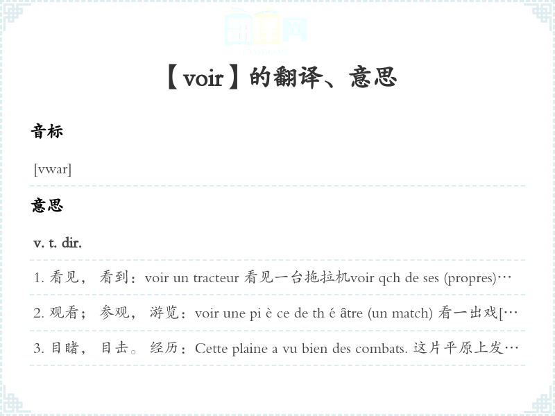 看, 看见:ne plus voir 失明, 眼瞎voir trouble 眼花, 看不清楚voir clair 看得一清二楚voir double (酒醉眼花时)把一物看成叠影On ne voit pas à dix pas. 十步外就看不见。 regarder sans voir 视而不见voir de loin (bien loin) [转]有远见, 看得远ne voir que par les yeux d'autrui 人云亦云voir avec les yeux de la foi 盲目相信, 迷信