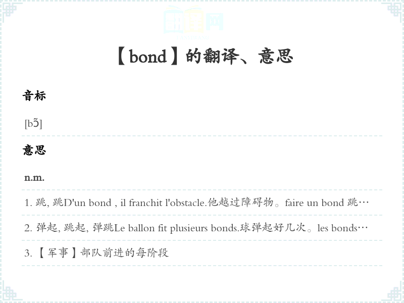 跳, 跳D'un bond , il franchit l'obstacle.他越过障碍物。faire un bond 跳跳;〈转义〉前进, 激增ne faire qu'un bond 突进le grand bond en avant大进bond actif【哲学】能动的飞progresser par bonds跳式地前进